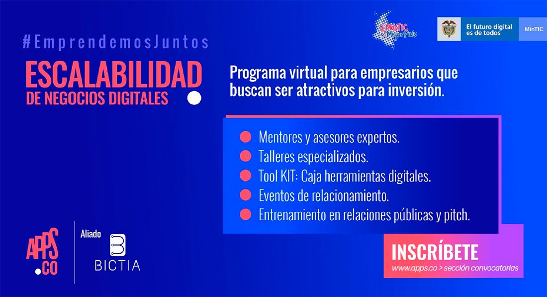 Los interesados pueden inscribirse y conocer los términos de referencia de esta fase (escalabilidad de negocios digitales) de alto nivel, que cierran el día 11 de agosto de 2020 a las 5:00 pm, en la sección de convocatorias en la web www.apps.co. Para más información escribe a convocatoria@bictia.com