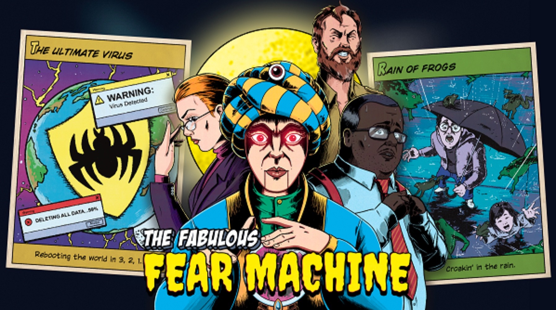 Justo a tiempo para la temporada de sustos, The Fabulous Fear Machine ofrece una campaña para un jugador trotamundos que convierte la histeria generalizada en un juego. Cada uno de los tres capítulos de la historia se centra en un nuevo Amo de la Máquina a medida que se desarrolla su retorcido juego de moralidad. Desde la conquista del mercado farmacéutico en Eurasia por parte de un científico, pasando por la torpe incursión en la política local de un vendedor de seguros de pueblo, hasta una historia infernal de tele evangelismo en América, el juego satiriza a los gigantes institucionales de la vida contemporánea.