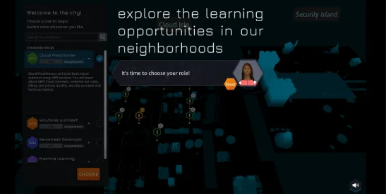 Seleccionar el juego de rol que se quiere empezar, se puede elegir entre Cloud Practitioner, Solutions Architect, Serverless Developer y Machine Learning Specialist.