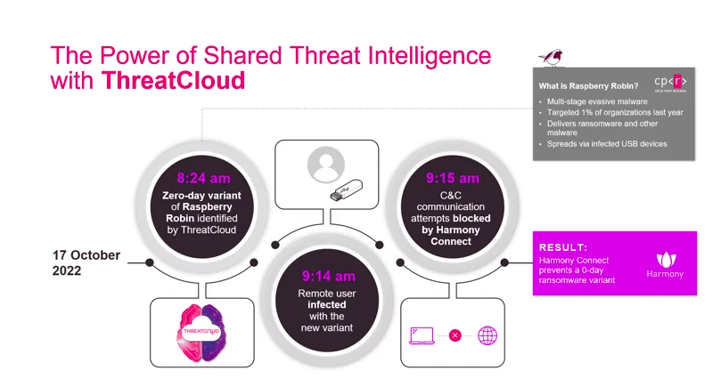 Como ejemplo, en octubre de 2022 se identificó una variante zero-day de un malware evasivo conocido como “Raspberry Robin”. Aproximadamente 45 minutos después de que la variante fuera agregada a Thread Cloud, un usuario remoto conectado a la red del cliente fue infectado a través de un dispositivo USB. Sin embargo, en menos de un minuto, la solución SASE de Check Point Software detuvo las comunicaciones de comando y control del programa malicioso, neutralizando el ataque, evitando la activación y propagación del malware.