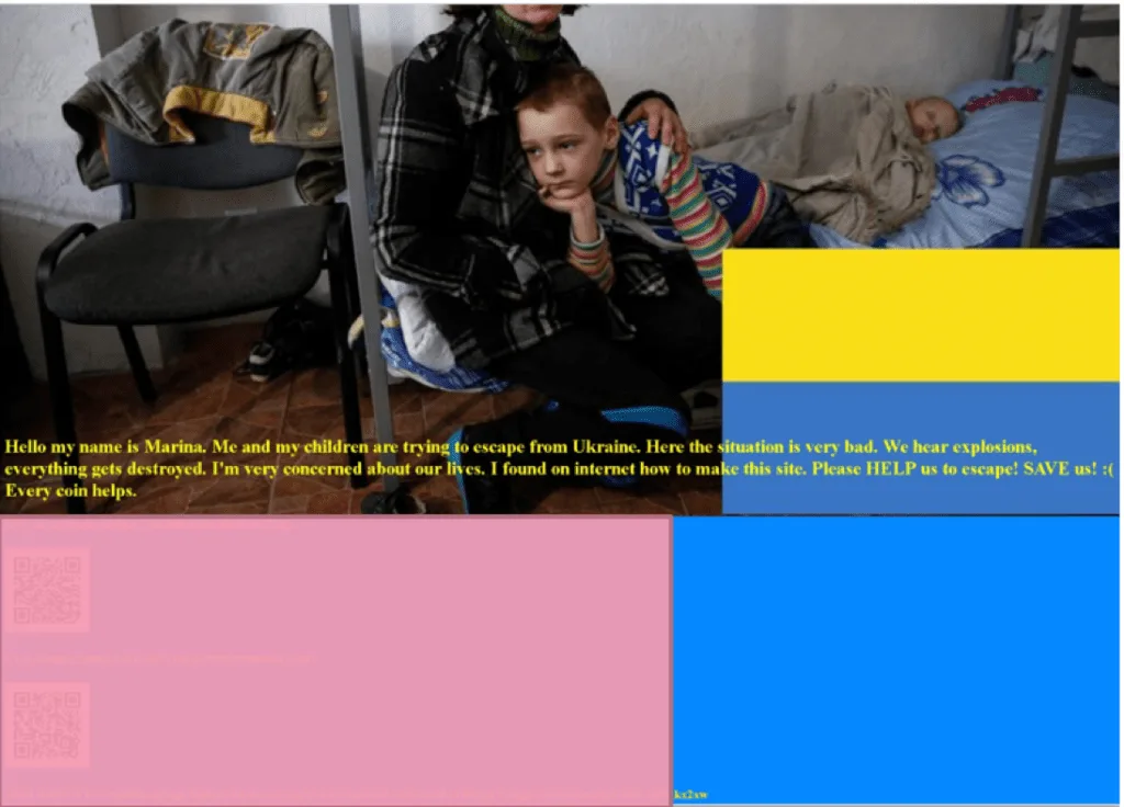 Una breve descripción afirma que «Marina» y sus hijos están tratando de escapar de Ucrania debido a una «muy mala situación» y están pidiendo dinero en criptomonedas El llamamiento también dice: «cada moneda ayuda».