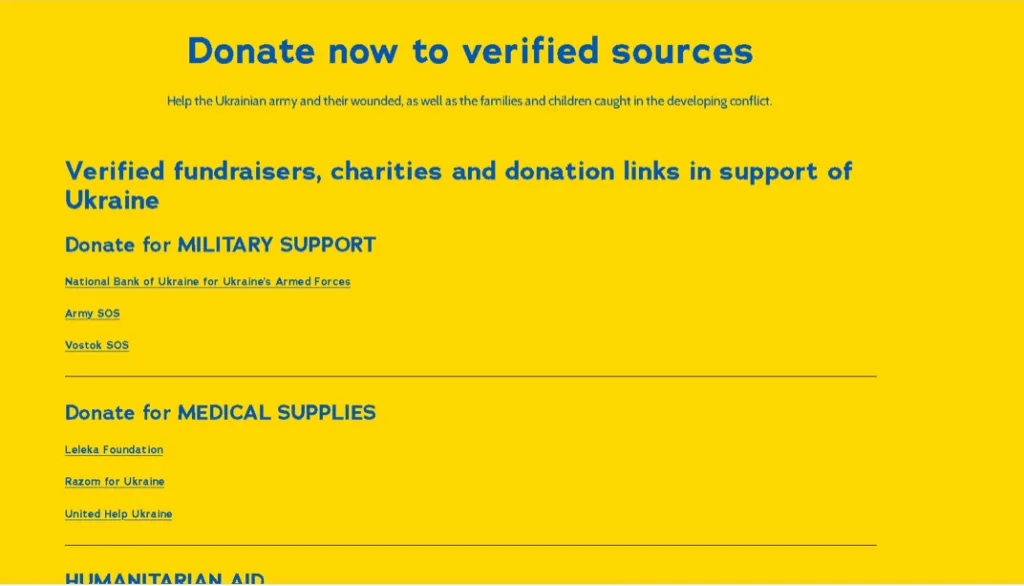Algunas de las páginas web a las que se hace referencia en la Darknet apuntan realmente a lugares fiables. El que destaca es: https://www.defendukraine.org/donate-, un sitio online que llama a los usuarios a «ayudar al ejército ucraniano y a sus heridos, así como a las familias y niños atrapados en el conflicto en desarrollo». También hace referencia a la cuenta de Twitter «Defiende Ucrania». El dominio se registró el 16 de febrero, una semana antes de que comenzara la guerra en Ucrania. La web en sí es sencilla y contiene una lista de diferentes organizaciones y ONG de Ucrania, así como de criptomonedas: Bitcoin, Ethereum y USDT.