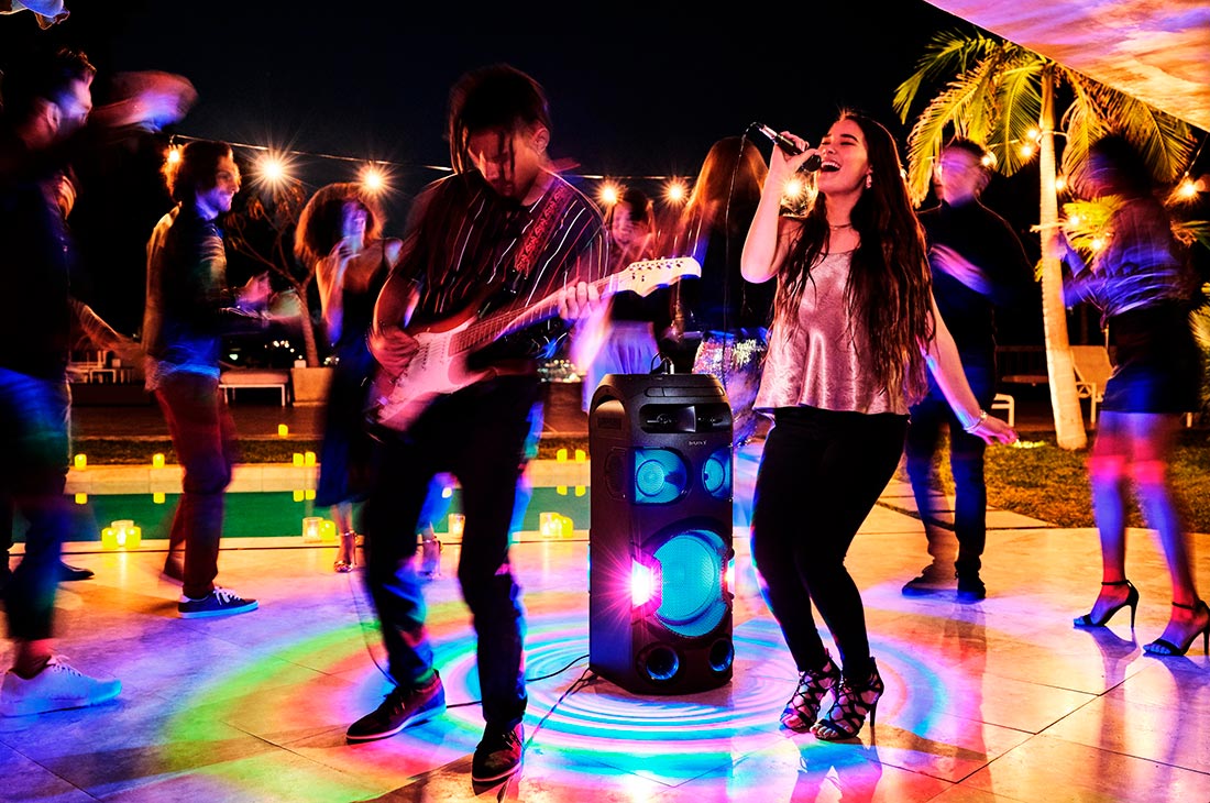 Y si en la fiesta tienes amigos que tocan guitarra, pueden conectarse al sistema de audio para usarlos como amplificadores en 3 modos: Nítido para un sonido claro; Distorsión, para un sonido de guitarra distorsionado; y Bajo, para tocar el bajo y continuar con la fiesta a través de distintos estilos.