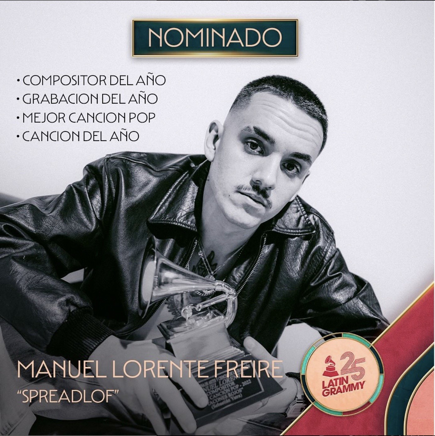 Manuel Lorente Freire, conocido en la industria musical como Spread Lof, celebra sus cuatro nominaciones a los Latin Grammy 2024, incluyendo la categoría de “Compositor del Año” por segundo año consecutivo. Además, ha sido nominado en las categorías de “Grabación del Año” y “Mejor Canción Pop” por su trabajo en “Igual Que Un Ángel” (Kali Uchis & Peso Pluma) y «Feriado» (Rawayana), así como en “Canción del Año” por “Entre Paréntesis” (Shakira y Grupo Frontera). Estas distinciones lo posicionan como una de las figuras más influyentes y prolíficas de la música latina contemporánea.